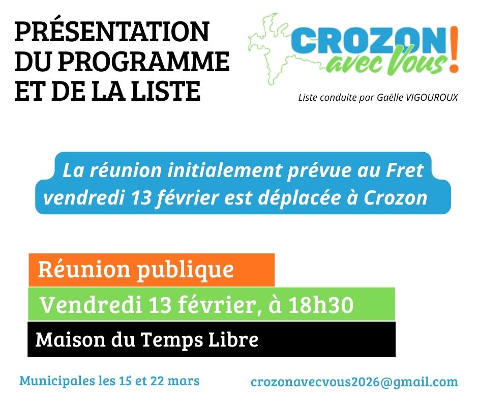 Nous avions prévu d’aller présenter notre liste et le programme de "Crozon avec Vous !" au Fret vendredi 13 février à 18H30. Hélas, la salle Ursule étant indisponible, nous sommes contraints de déplacer cette rencontre à la Maison du Temps libre, à Crozon.